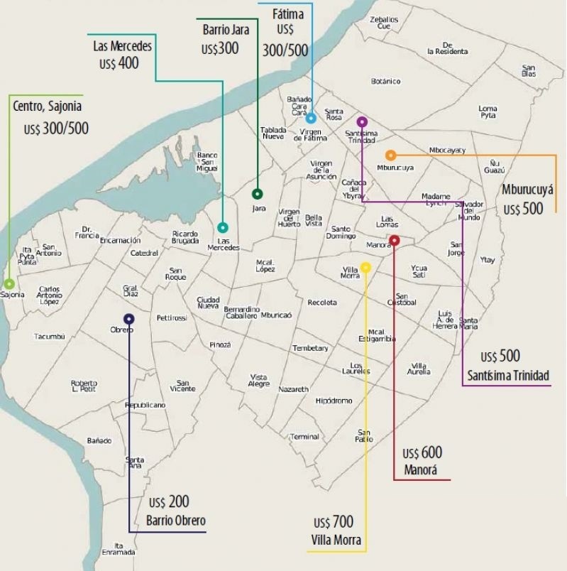 Auf der Skala der Quadratmeterpreise der verschiedenen Stadtteile erkennt man schnell, wo man sicher und unsicher leben kann. Während in den Stadtteilen Obrero, Sajonia und Fatima bis zu 300 US-Dollar noch als normal gelten für einen Quadratmeter sind in Manorá, Mburucuyá und Villa Morra bis zu 1000 US-Dollar notwendig.